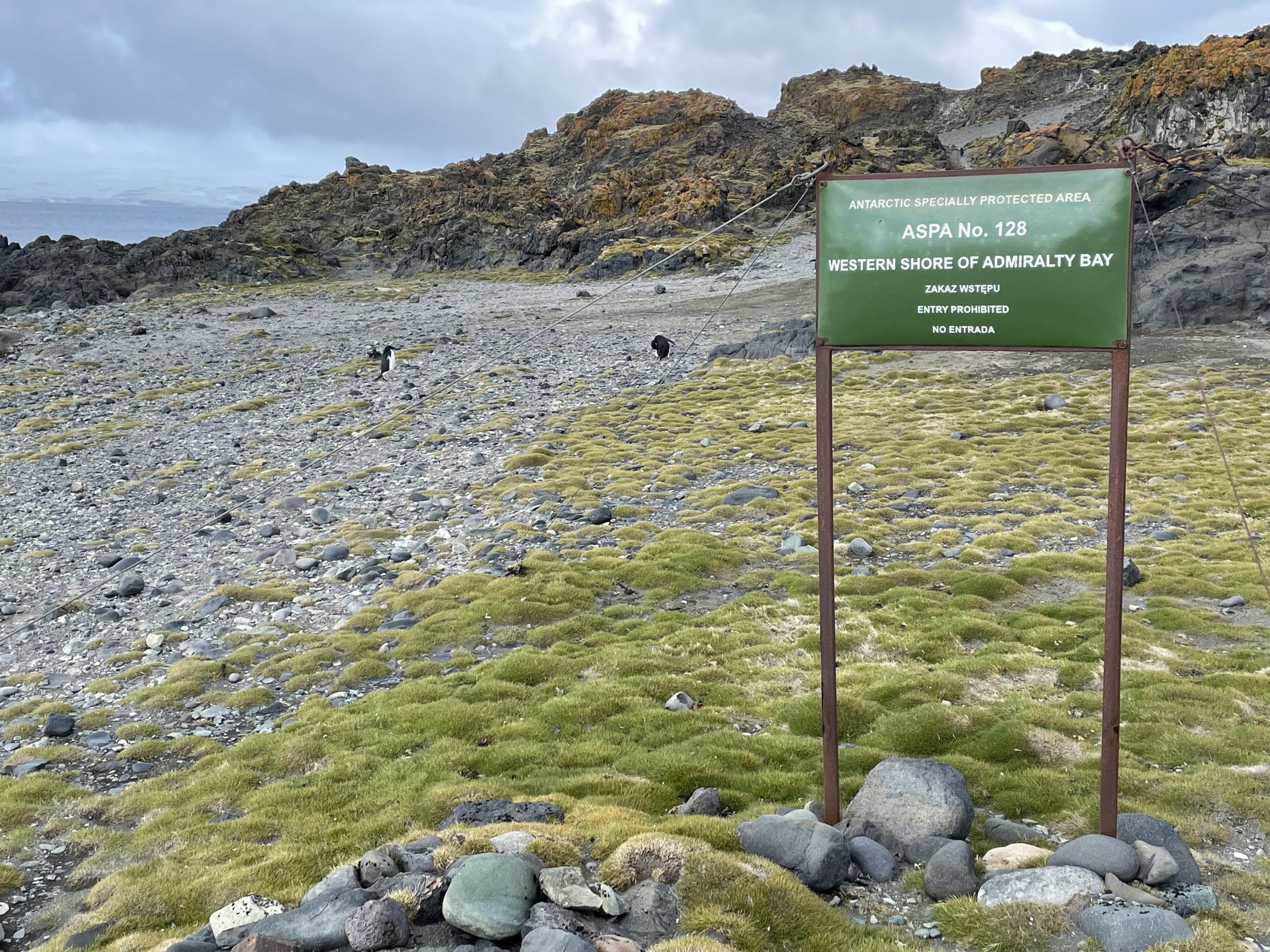 ASPA 128 Western Shore of Admiralty Bay is located approximately 700 m southeast of the Station. It covers almost 17 km2, more than half of which is ice-free. The rest of the ASPA 128 is covered by glaciers descending from the Warsaw Icefield. Only one of them, the Ecology Glacier, reaches the Bay. The area was established to ensure the protection of the rich fauna (productive and resting areas of penguins, flying birds, pinnipeds) and flora (moss and lichens) of the area. Monitoring of birds and mammals has been carried out in ASPA 128 since 1977 (one of the longest series of data in the Antarctic). The ASPA 128 area hosts the American seasonal Copacabana station and the Polish Demay base.