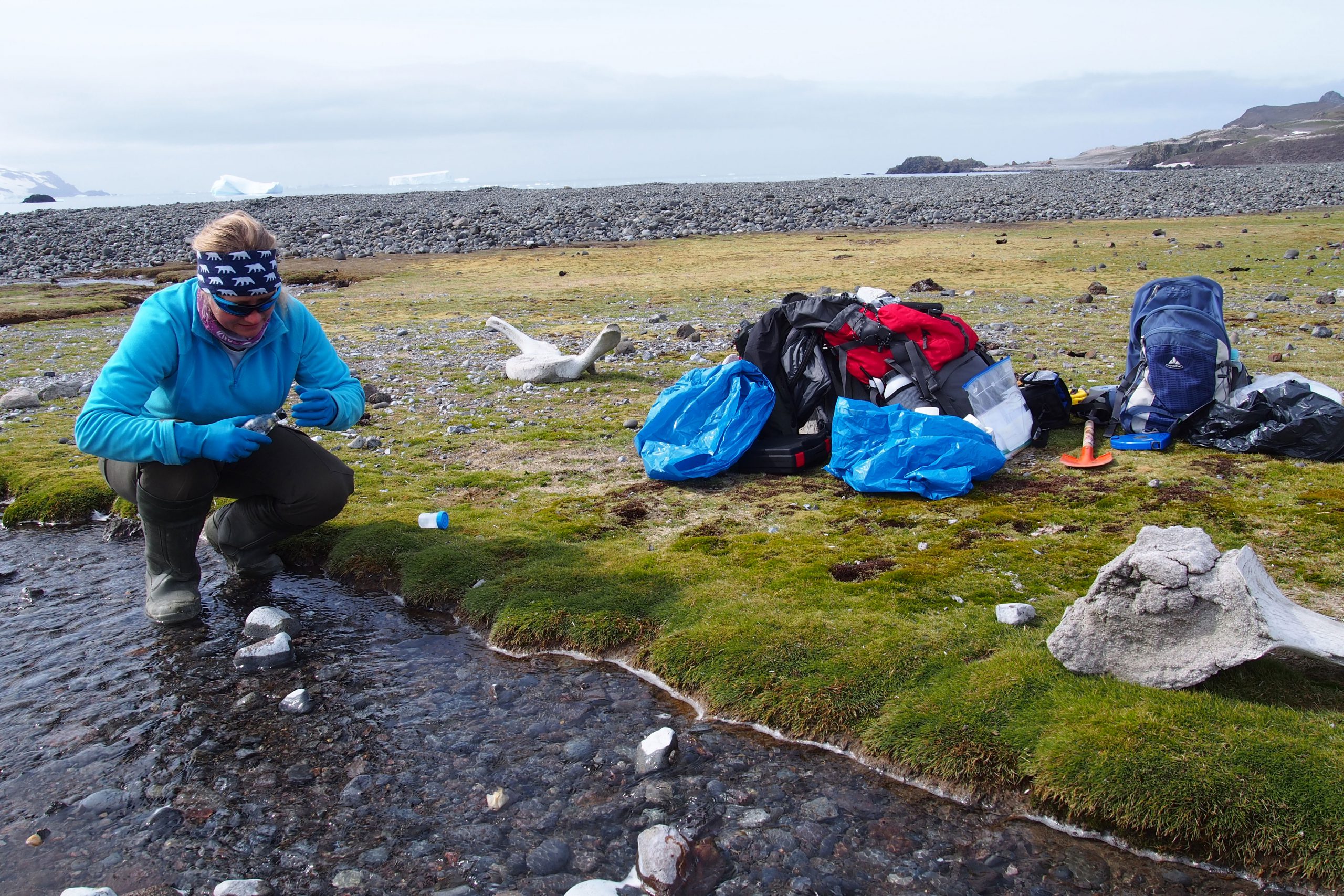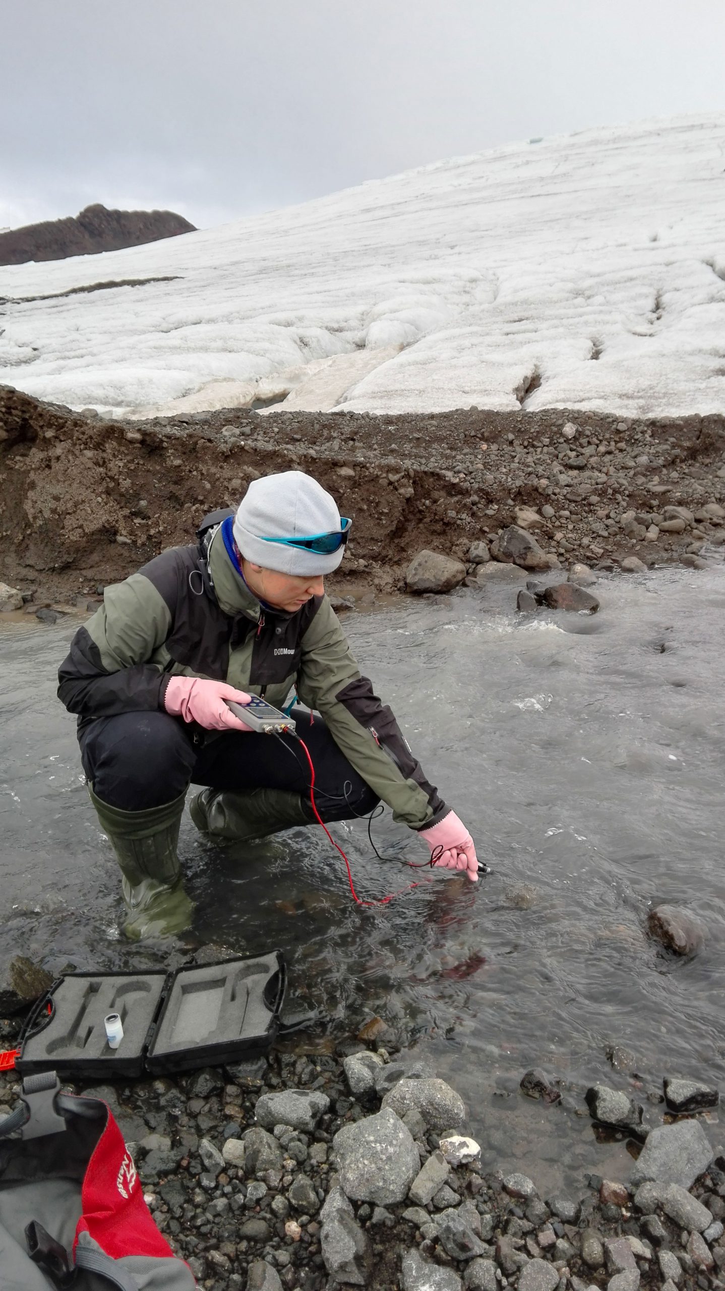 Pomiar przewodności elektrolitycznej wody w strumieniu przy Lodowcu Ekologii, fot. Anna Grebieniow